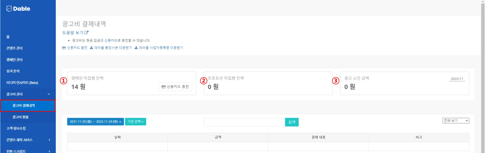 계좌이체: 광고가 게재되기 전에 광고비를 입금합니다. 최초 입금 시 최소 입금 금액은 100만 원(VAT별도) 입니다. 광고비를 입금하면 데이블에서 입금 확인 후 광고비를 계정에 충전합니다. 입금 확인이 어려운 주말, 공휴일 입금시 충전이 지연될 수 있습니다. 마케팅 대시보드 내 ‘광고비 관리’ 메뉴 하단 ‘광고비 결제내역‘페이지에서 데이블 사업자 등록증과 통장 사본을 확인할 수 있습니다.