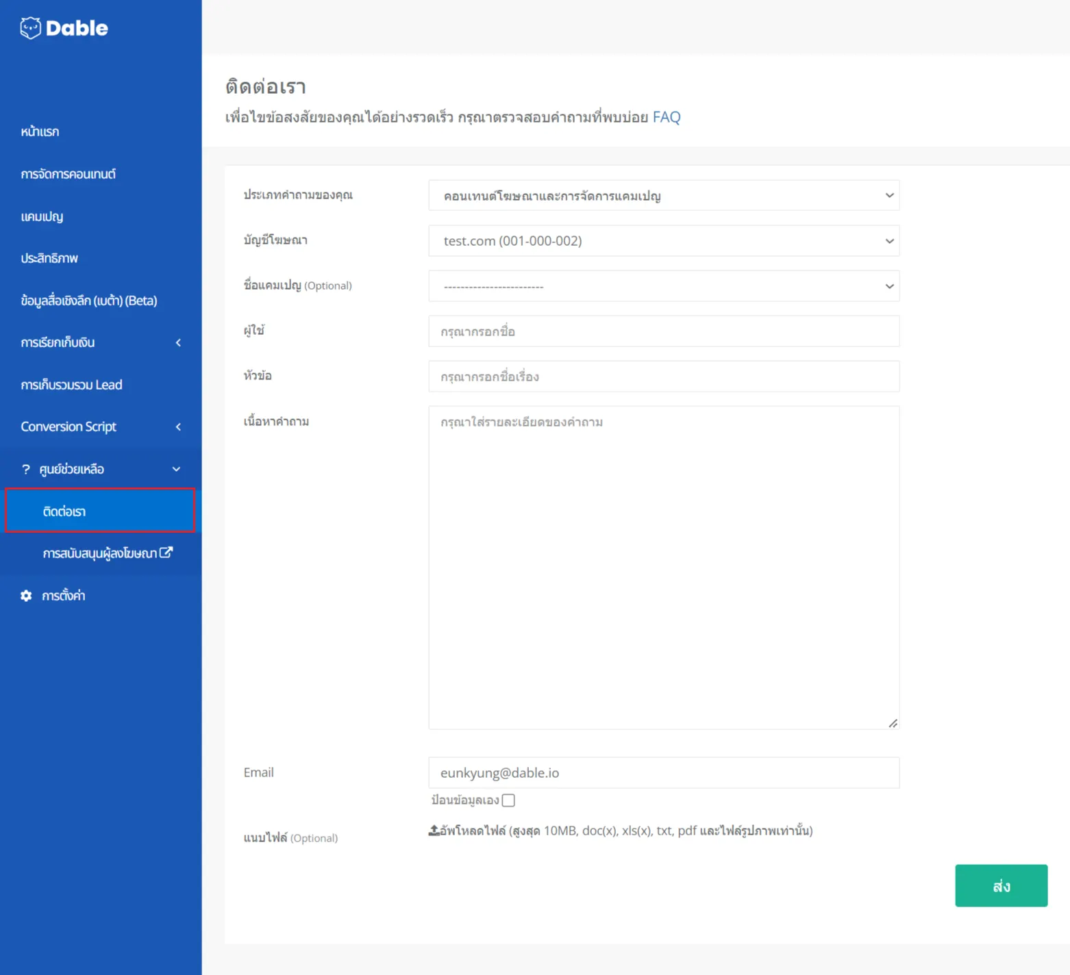 หากมีข้อสงสัยเกี่ยวกับการจัดการโฆษณาและประสิทธิภาพโฆษณา โปรดติดต่อมาที่ Dable ได้ทุกเมื่อ สำหรับการช่วยเหลือที่รวดเร็ว โปรดคลิกที่ลิงก์ “ติดต่อเรา (Contact Us)” ภายใต้ “ศูนย์ช่วยเหลือ (Help Center)” หรือสอบถามมาทาง ad-th@dable.io หรือทางเพจ เพื่อส่งข้อมูลของคุณมายังทีมงาน Dable ประเทศไทย