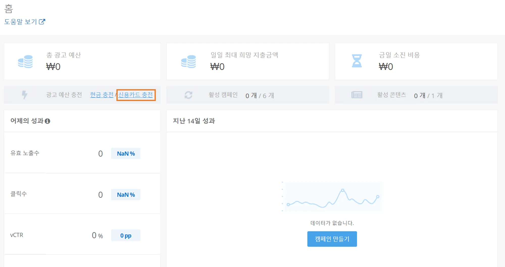 마케팅 대시보드 내 여러 영역에 위치 된 ‘Credit Card’ 옵션을 클릭하면 결제가 가능합니다