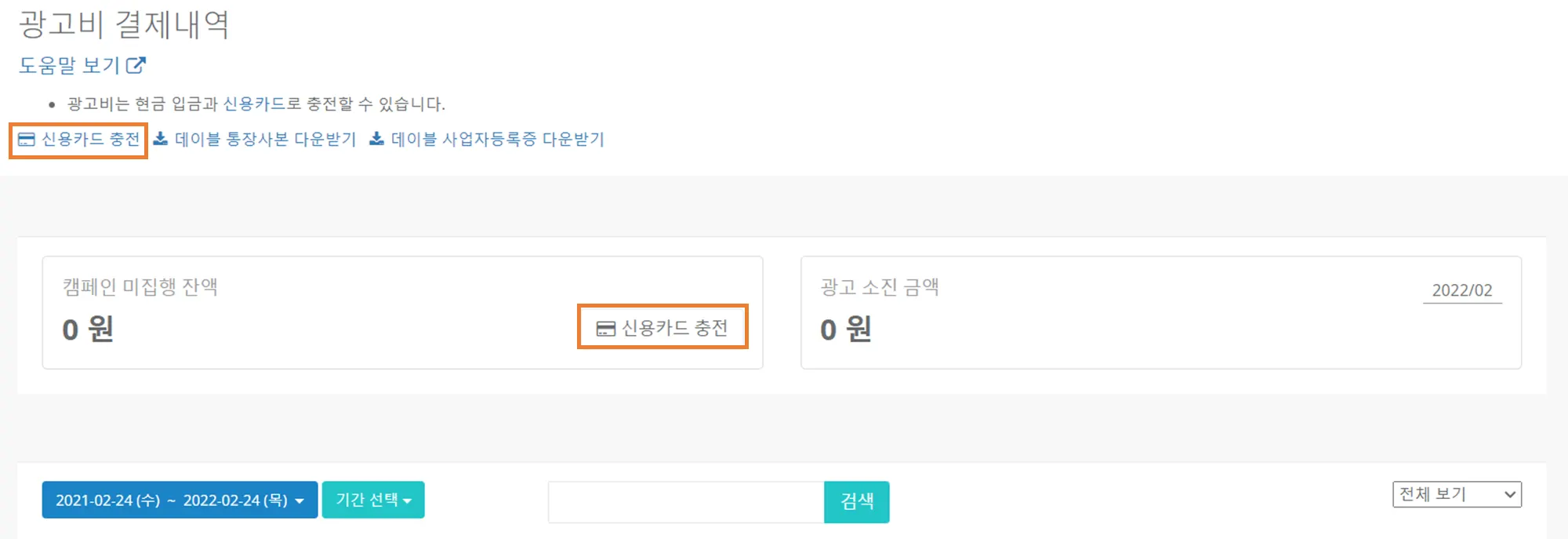 ‘광고비관리 – ‘광고비 결제 내역’ 메뉴에서 해당 월의 ‘캠페인 집행’ 비용 및 ‘청구 금액’을 확인할 수 있습니다. 이 금액은 공급가액입니다. 부가가치세를 포함한 금액은 결제영수증을 통해 확인할 수 있습니다.