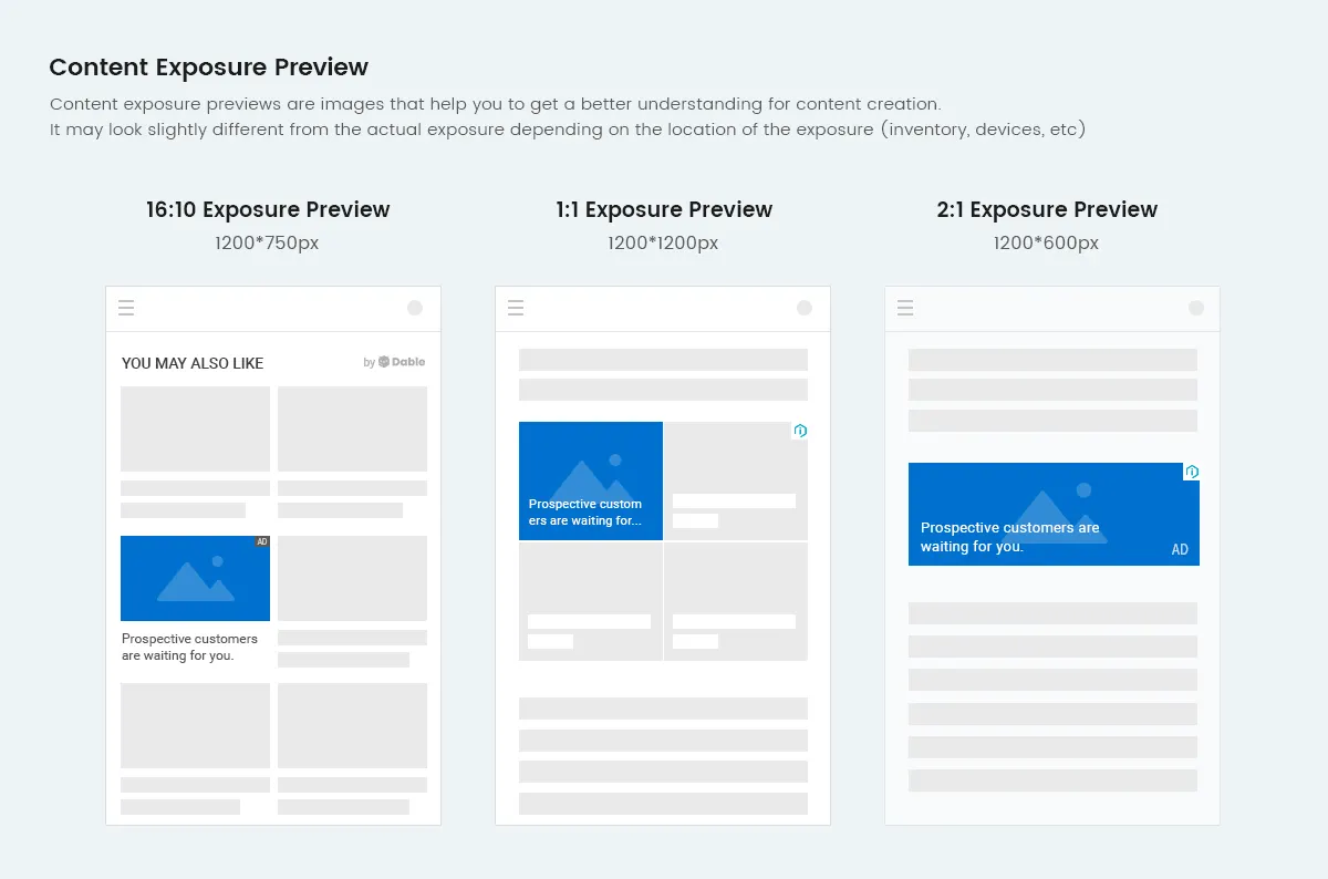 Dable provides 16:10 (default), 1:1, and 2:1 ratio thumbnail areas to help you expose more ads on various media and partner sites.