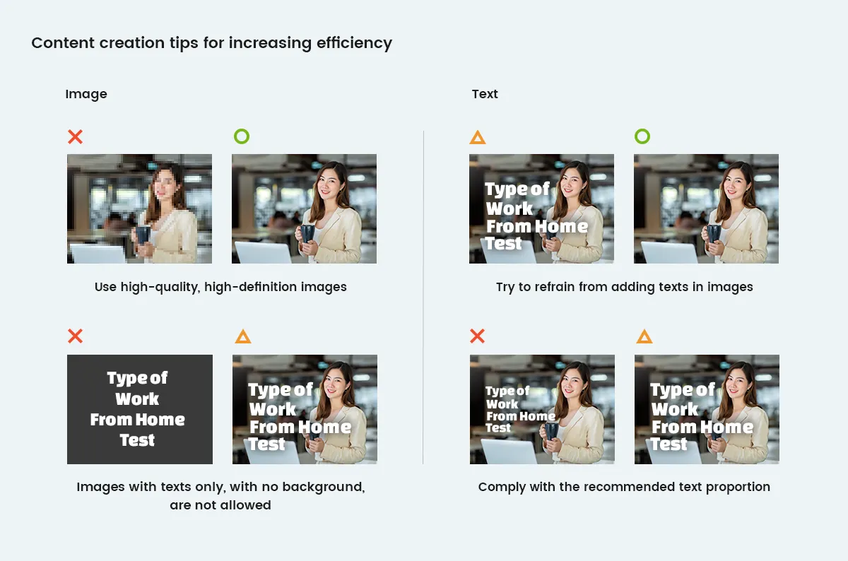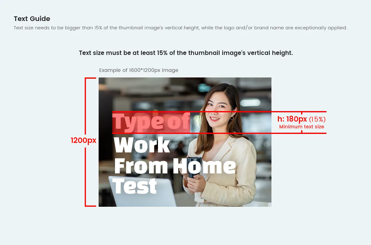 eg) For a thumbnail image of 1600*1200px, text size must be at least 180px (15% of 1200px) for approval.