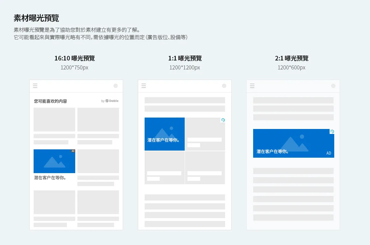 為確保廣告能在 Dable 所有版位最佳化曝光,建議依照推薦尺寸上傳圖片。