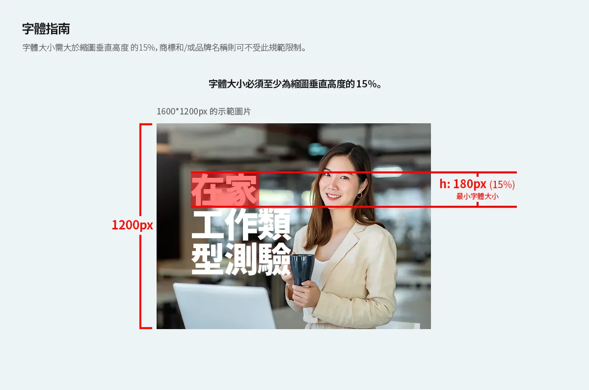 例如: 1600*1200 像素的縮圖,字體大小必須至少為 180 像素(1200 像素的 15%)才能審核通過。
