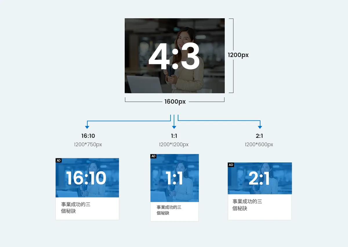 為了簡化廣告圖片製作流程,在圖片上傳的第一階段提供了能直接將圖片裁剪成 3 種不同比例的功能。