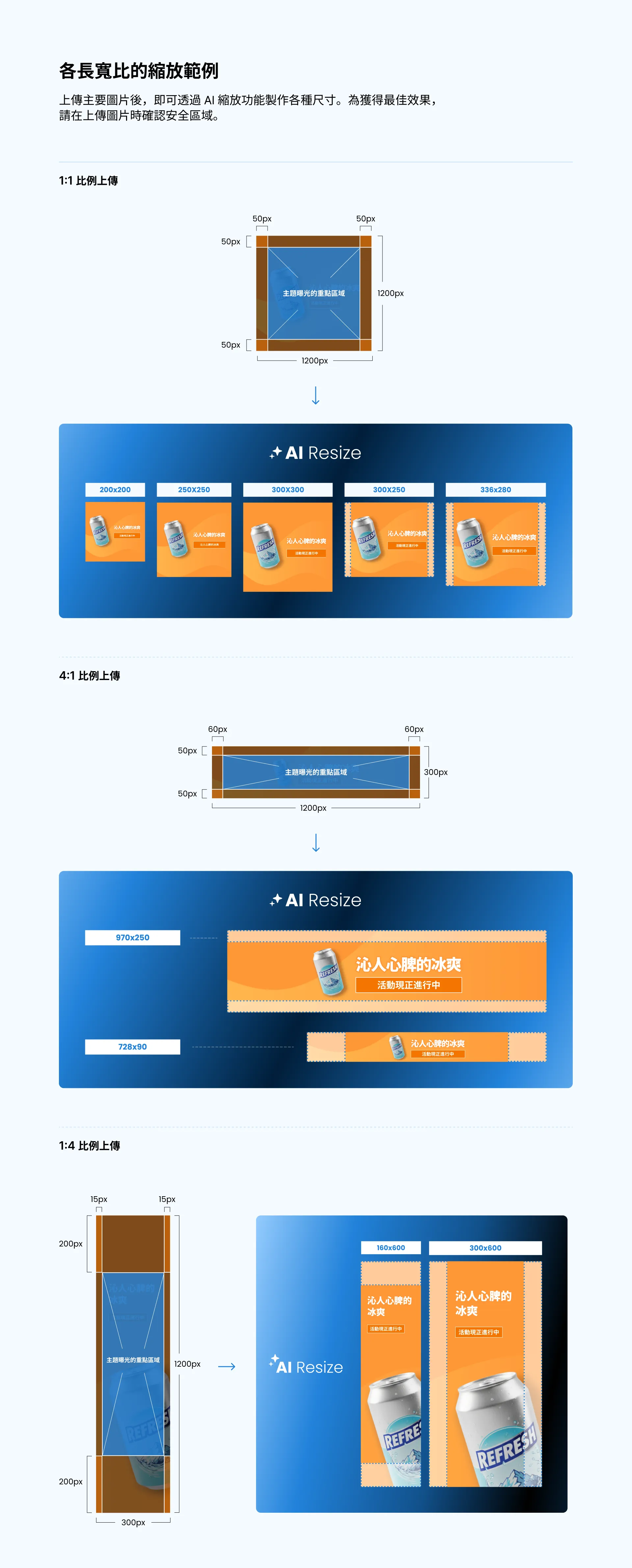 請將標誌、文案與 CTA 隨意放置在安全區域中,並使用背景圖或顏色填滿背景的外圍區域,以便 AI 能夠順暢地進行調整。