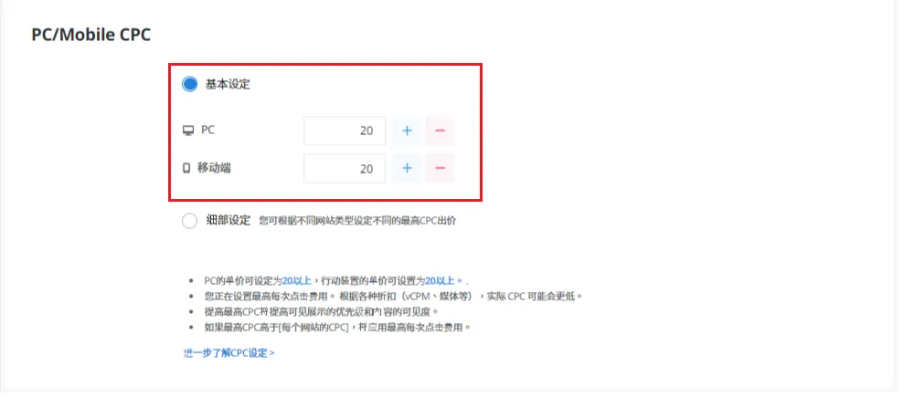 活动管理 – 选择要修改的广告活动 – 到“电脑/行动装置 CPC” - 点击“详细设置” – 输入金额并按下‘储存’