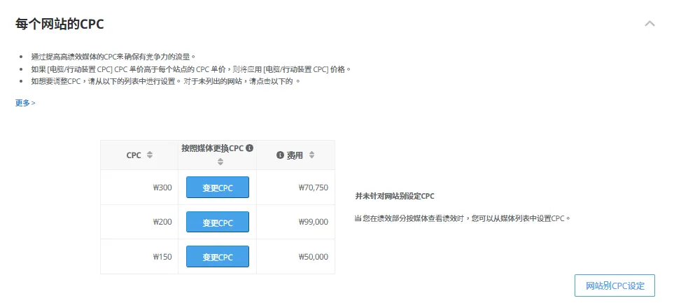 – 按下‘变更CPC’ – 输入金额并按下‘网站别CPC设定”