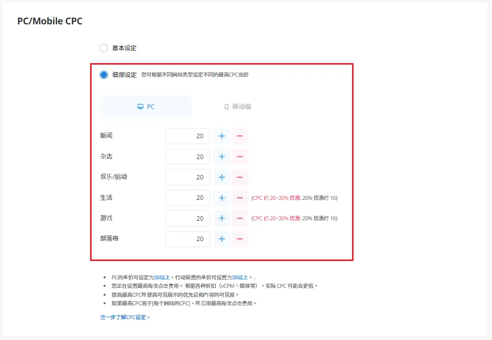 您可以按媒体类型和装置调整广告活动的最高CPC。可能依照不同的媒体类型提供CPC折扣。
