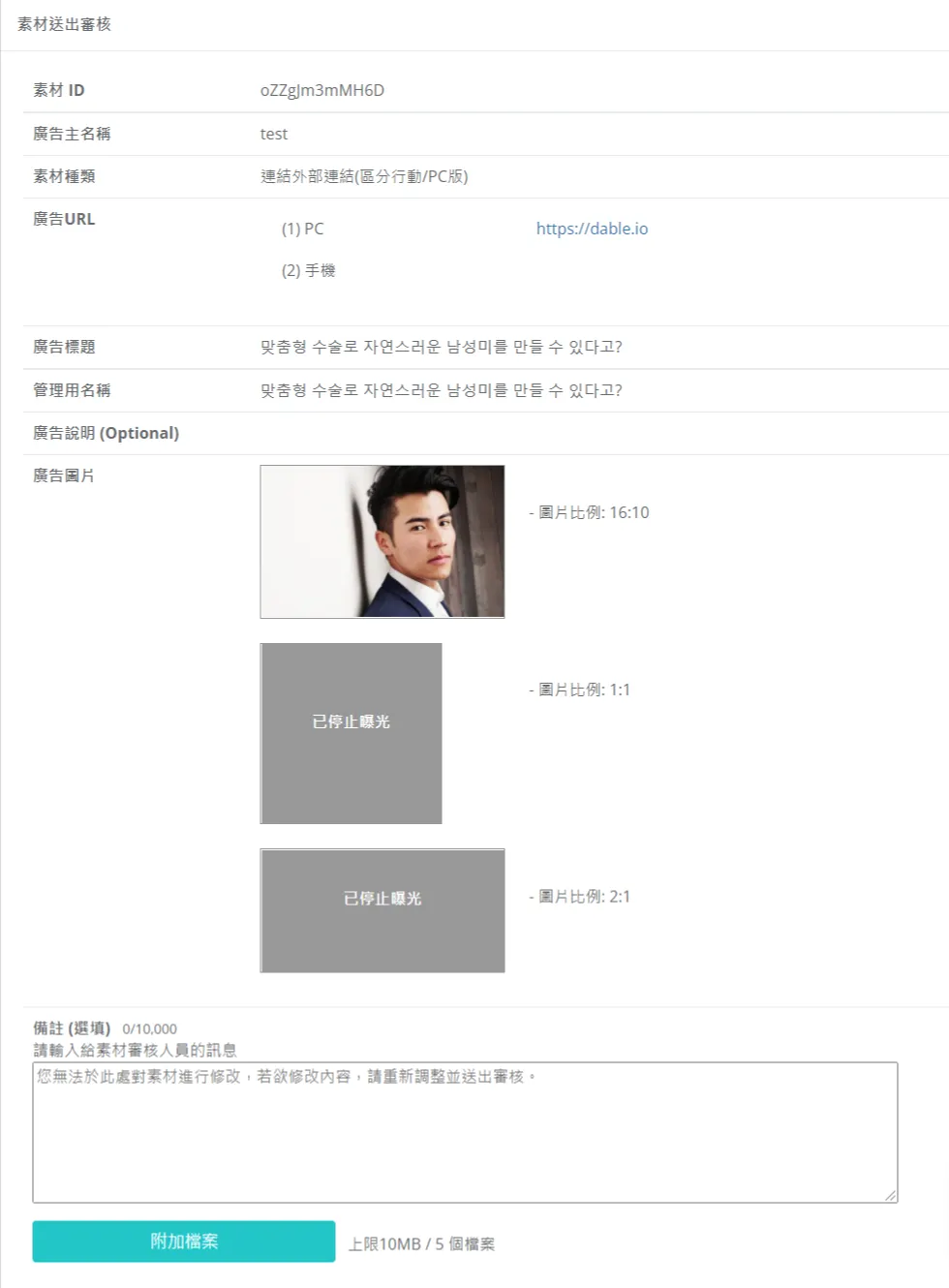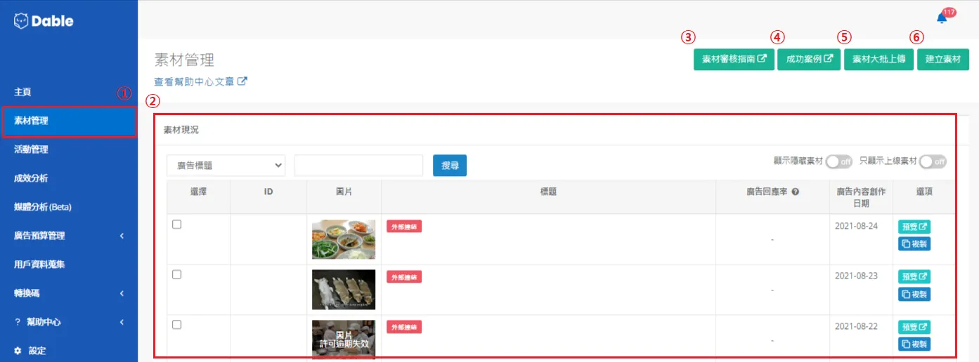 一旦素材建立後,可以在多個廣告活動中使用。Dable 將會審查素材是否符合規範,唯有審核通過的素材才可在媒體網站曝光。