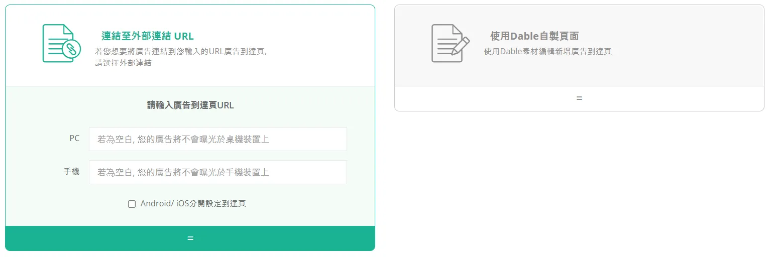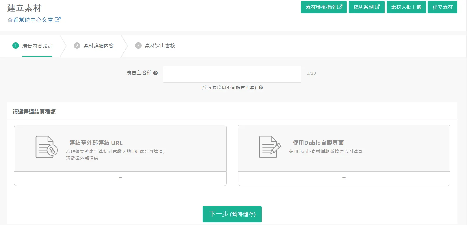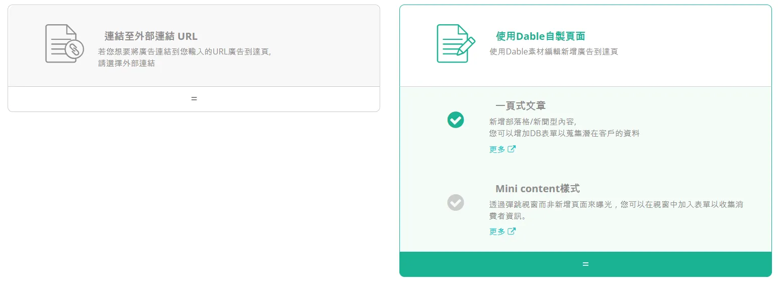 根據著陸頁面的格式,有兩種類型的素材可供選擇 - 外部連結和Dable自製頁面。您可以透過以下 3 個步驟建立素材: