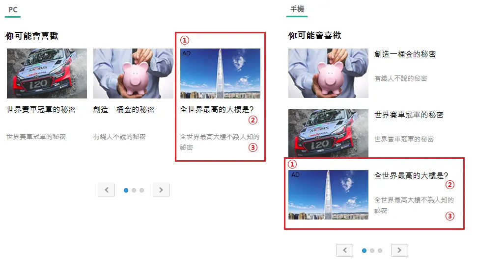 ① 圖片:縮圖 ② 廣告標題 ③ 廣告說明(可選填)