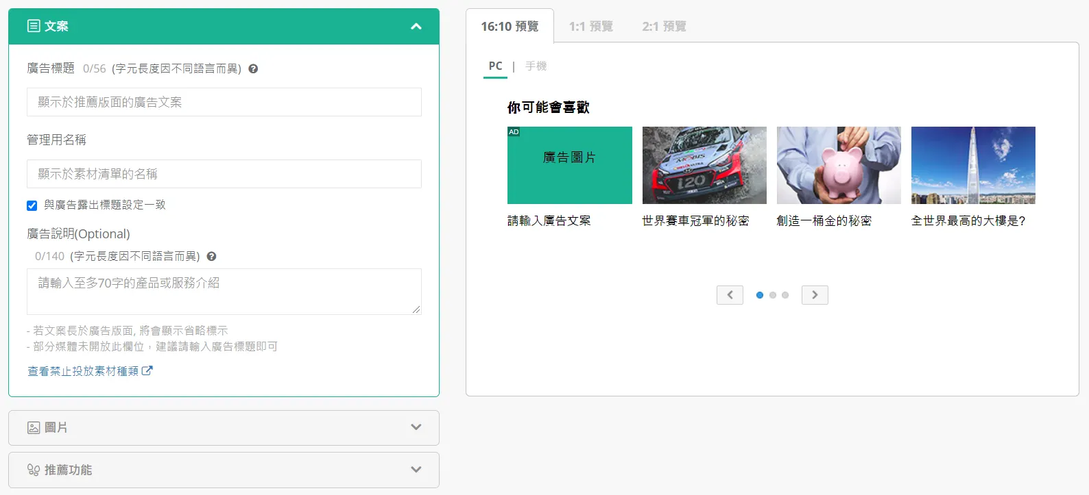 新增要在您的素材中使用的廣告文字和圖片(縮圖)。 您還可以使用追蹤工具查看用戶在按下您的廣告後進行了哪些操作。
