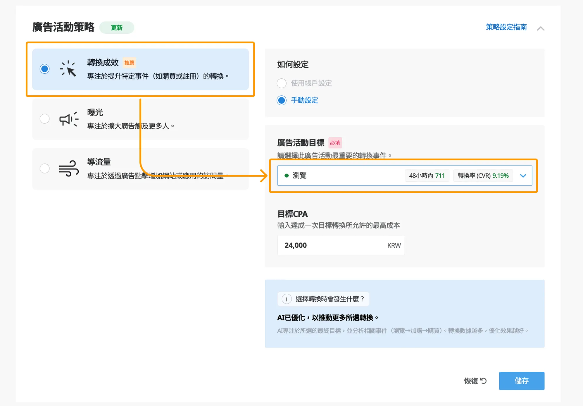 轉換:提升特定事件的轉換率,例如購買或註冊。