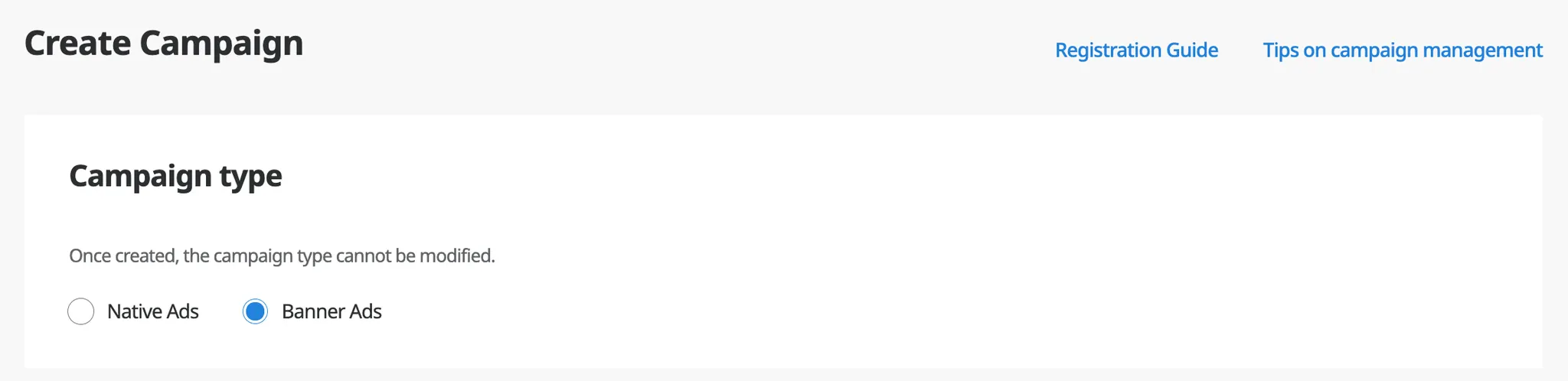 When creating an ad campaign, you must select either Native or Banner as the campaign type.