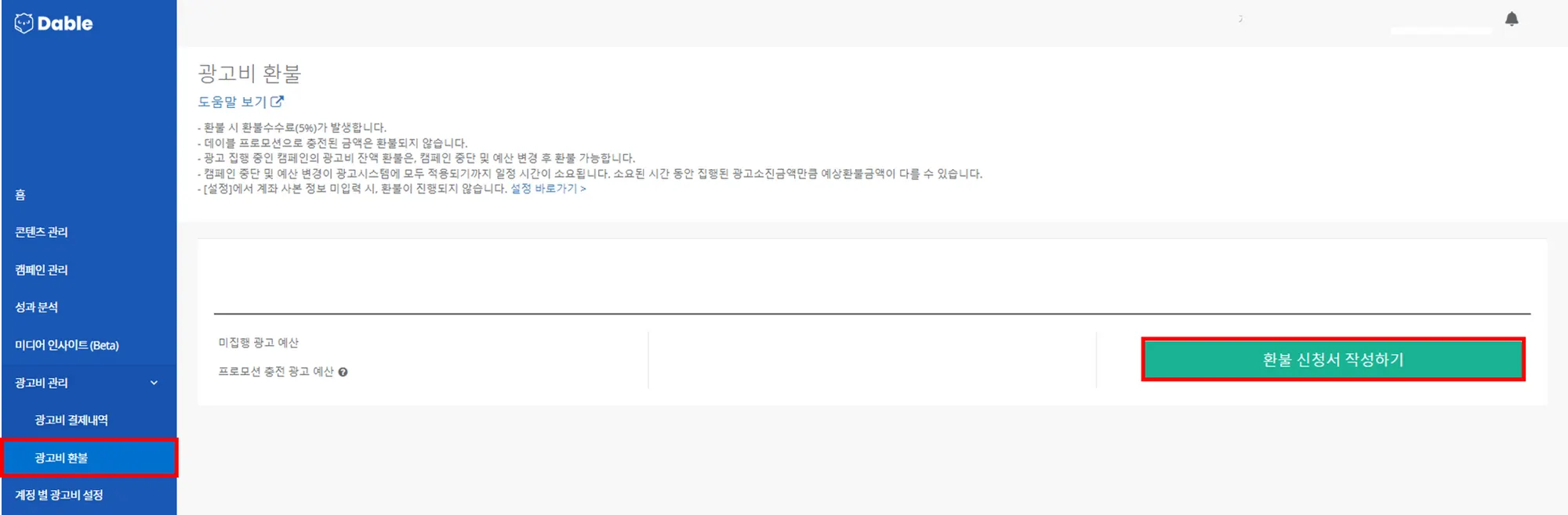 데이블에서 환불 신청내역을 검토합니다. 영업일 1일 이내로 검토 완료되며 결과는 메일 또는 ‘광고비 환불’ – ‘신청내역’에서 확인할 수 있습니다. 데이블에서 검토 완료 전 언제든지 환불 신청을 취소할 수 있습니다. 환불 승인 결과를 받으면 ‘최종 환불 금액 동의’를 합니다.