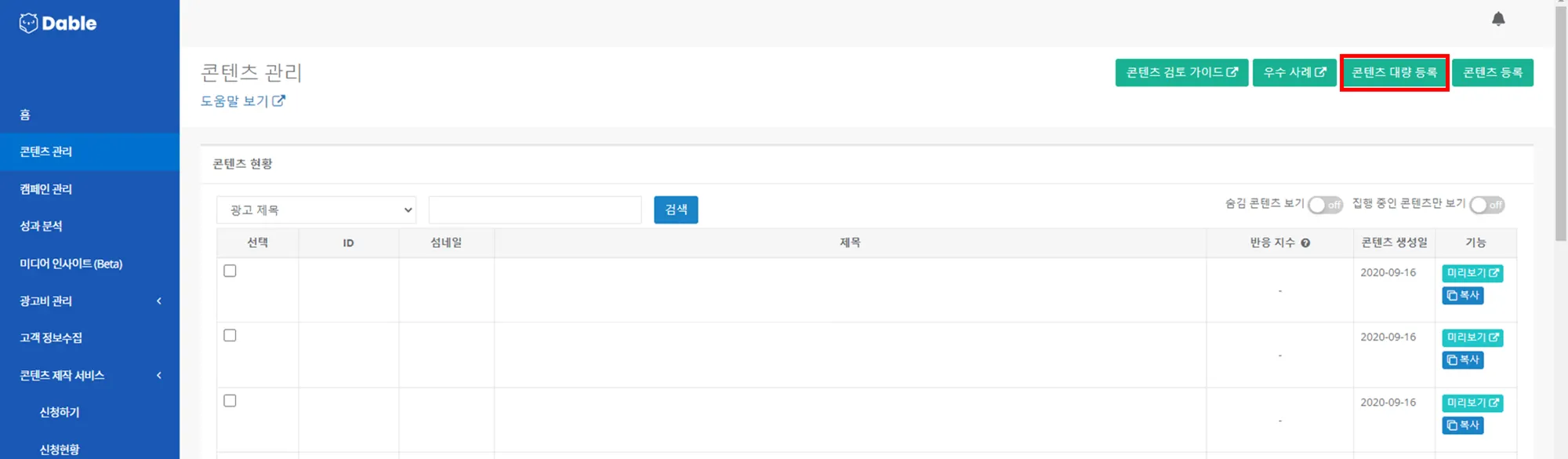 ‘저장’을 클릭하면 콘텐츠 대량 등록이 완료됩니다. 데이블은 등록된 콘텐츠가 데이블의 정책을 준수하는지 검토합니다.