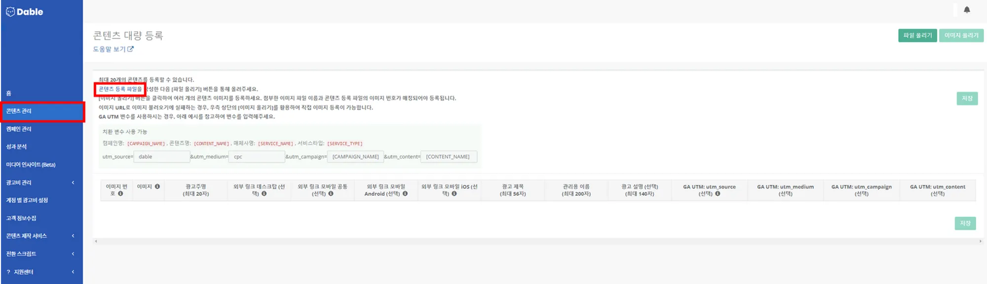 ‘콘텐츠 대량등록’은 엑셀 파일을 업로드해 다수의 콘텐츠를 일괄 등록하는 기능입니다. 이 기능을 사용하면 최대 20개까지 콘텐츠를 한번의 업로드로 등록해 시간을 절약할 수 있습니다.