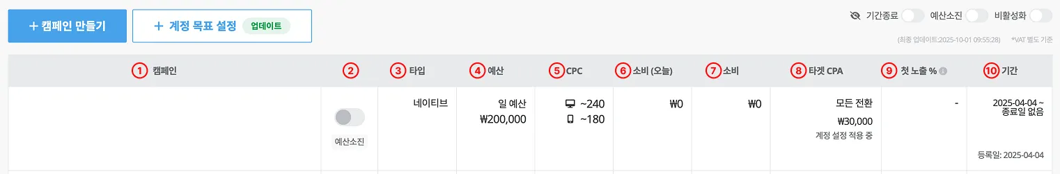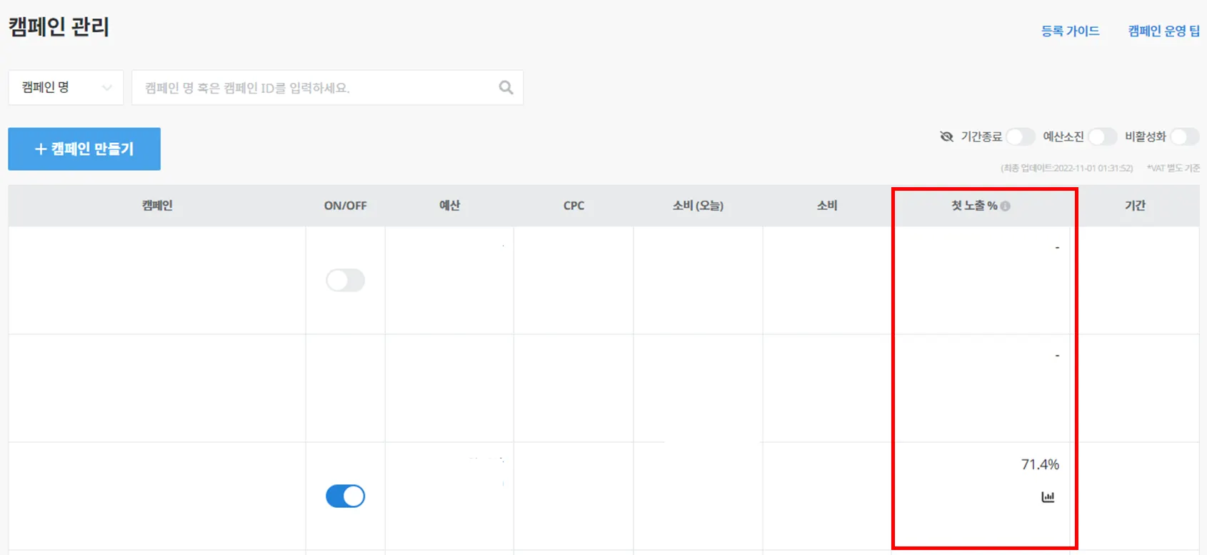 기간이 종료되거나 예산 소진된 캠페인은 ON을 클릭해 목록에서 캠페인을 숨김처리 합니다.