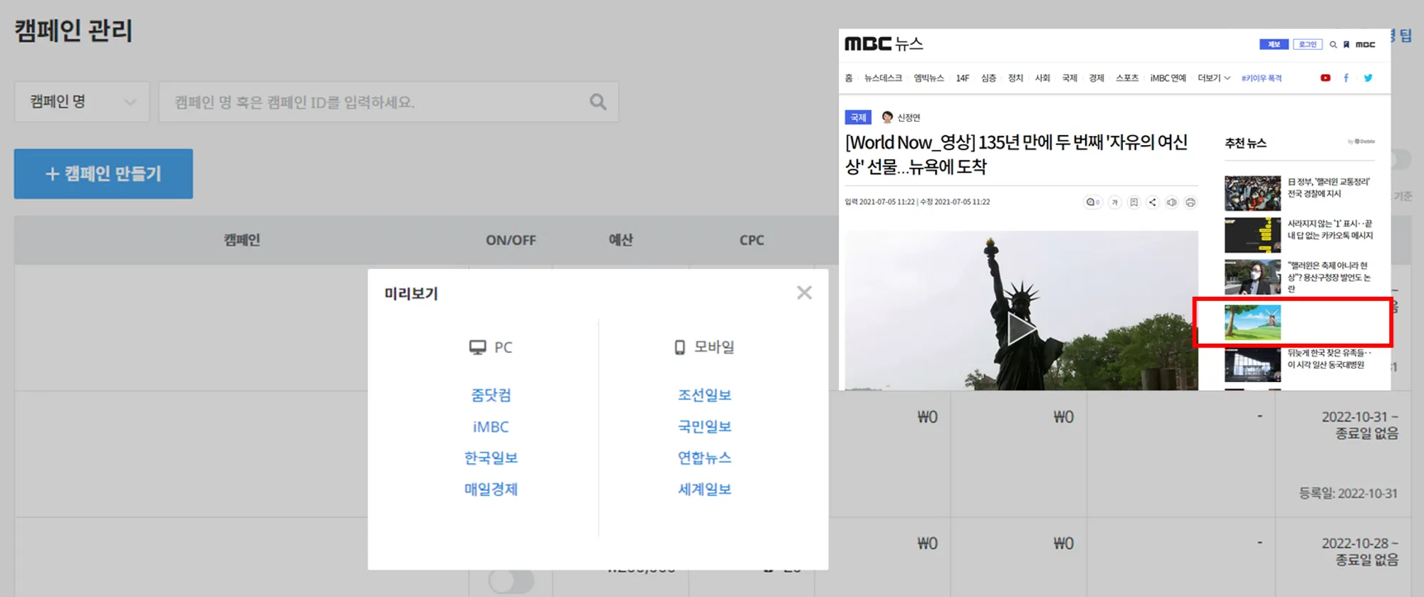 캠페인 관리 – 확인하고자 하는 캠페인 제목 왼쪽 미리보기 클릭 – 보고자 하는 미디어와 디바이스 선택 – 지면 하단 ‘당신이 좋아할 만한 기사’ 영역 확인