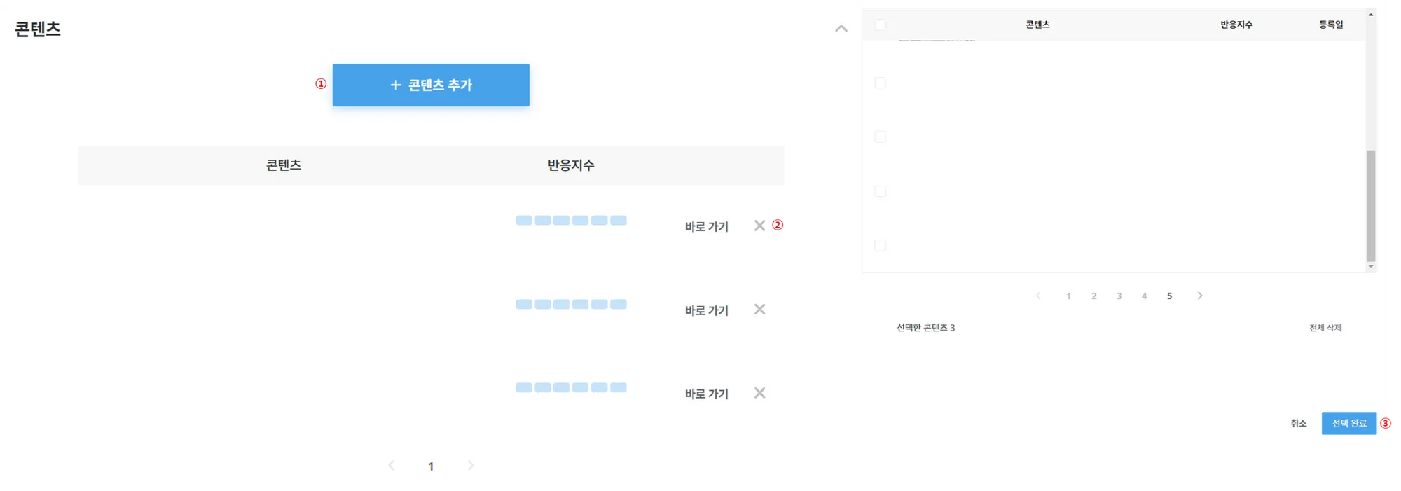 캠페인 관리 – 변경하고자 하는 캠페인 선택 – “+콘텐츠 추가” 클릭 – 클릭 후 목록에서 추가할 콘텐츠 선택 – ‘선택 완료’ 클릭