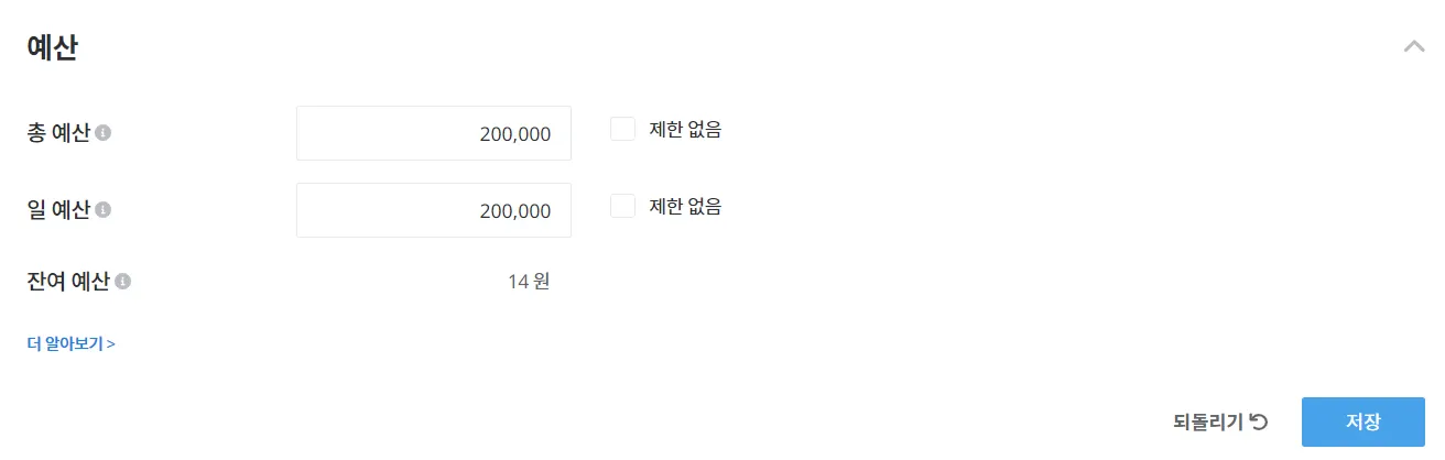 실시간 광고 노출과 클릭 발생으로 소진 금액에 차이가 있을 수 있어 활성화 중인 캠페인은 비활성화 후 6시간이 지난 후 예산 방식을 변경할 수 있습니다.