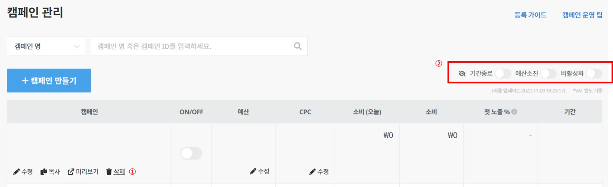현재 활성화된 캠페인만 목록에 보이고자 한다면 ‘비활성화’를 ON 하세요.