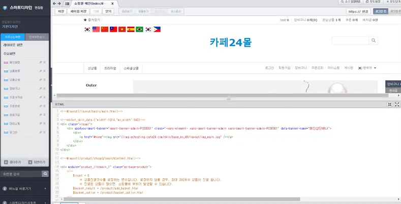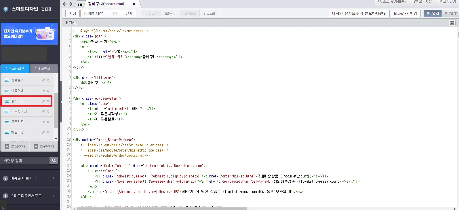 경로: 스마트디자인 편집창 > 장바구니 페이지에서 스크립트를 삽입합니다.