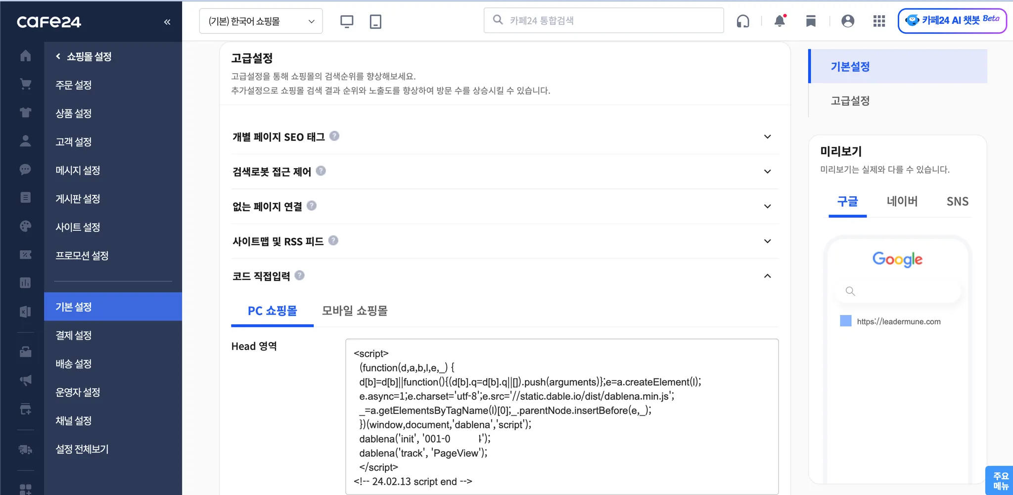 경로: 쇼핑몰 설정 > 기본 설정 > 쇼핑몰 정보 > 검색엔진 최적화(SEO) > 고급 설정 > 코드 직접 입력