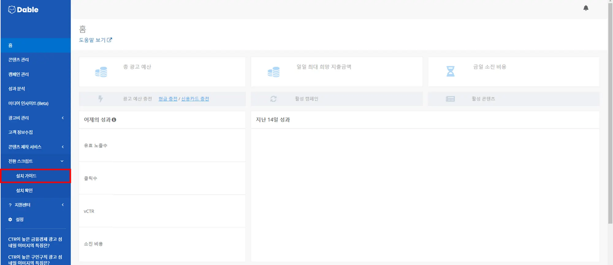 현재 사용 중인 광고 계정의 전환 스크립트는 대시보드 좌측 메뉴의 `전환 스크립트` 항목에서 확인하실 수 있습니다.