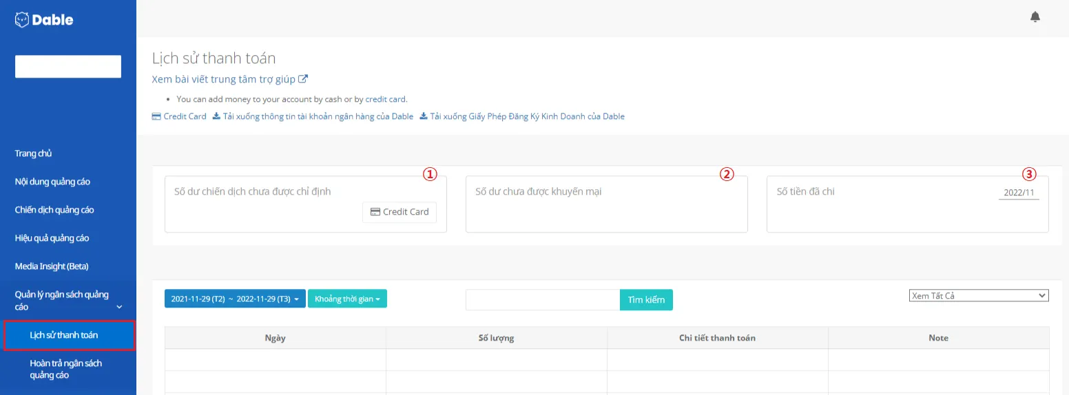 Chuyển khoản ngân hàng: Trước tiên, bạn cần phải nạp tiền vào tài khoản của mình để phân bổ quảng cáo. Nếu đây là lần đầu tiên bạn thực hiện thanh toán, xin lưu ý rằng khoản thanh toán tối thiểu là 1 triệu won (không bao gồm VAT). Sau khi bạn thực hiện thanh toán, Dable sẽ kiểm tra số tiền và nạp vào tài khoản của bạn. Có thể có sự chậm trễ trong quá trình này nếu bạn nạp tiền vào cuối tuần hoặc ngày lễ. Để xem giấy phép kinh doanh và sổ ngân hàng của Dable, vui lòng chuyển đến trang Tổng quan Tiếp thị (Marketing Dashboard) và nhấp vào "Lịch sử thanh toán" trong 'Thanh toán'.