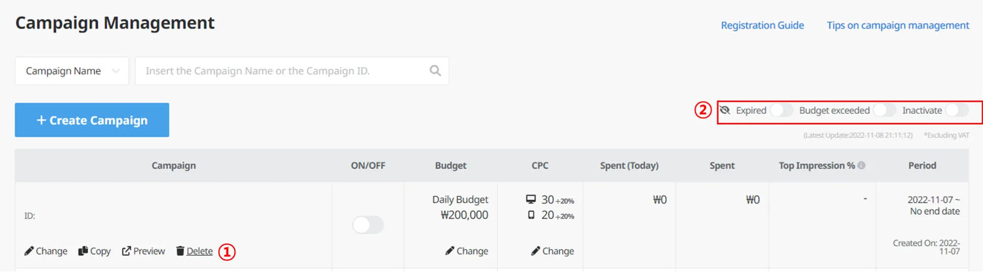 Hide campaigns that have expired or depleted their budget. To do so, change the toggle switch to ON.