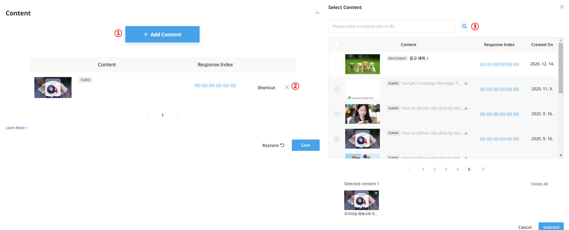 Campaign Management – Select the campaign – Go to ‘Content’ – Click ‘+ Add Content’ button – Select and/or delete the contents – ‘Selected’ - ‘Save’