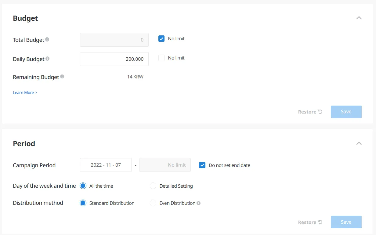 Click the campaign you want to change and select the wanted budget spending option in ‘Budget’ and ‘Period’. Then click Save on each respective columns.