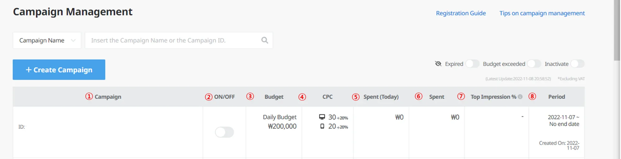 ② Toggle to enable/disable the campaign. When ON, ads are served.