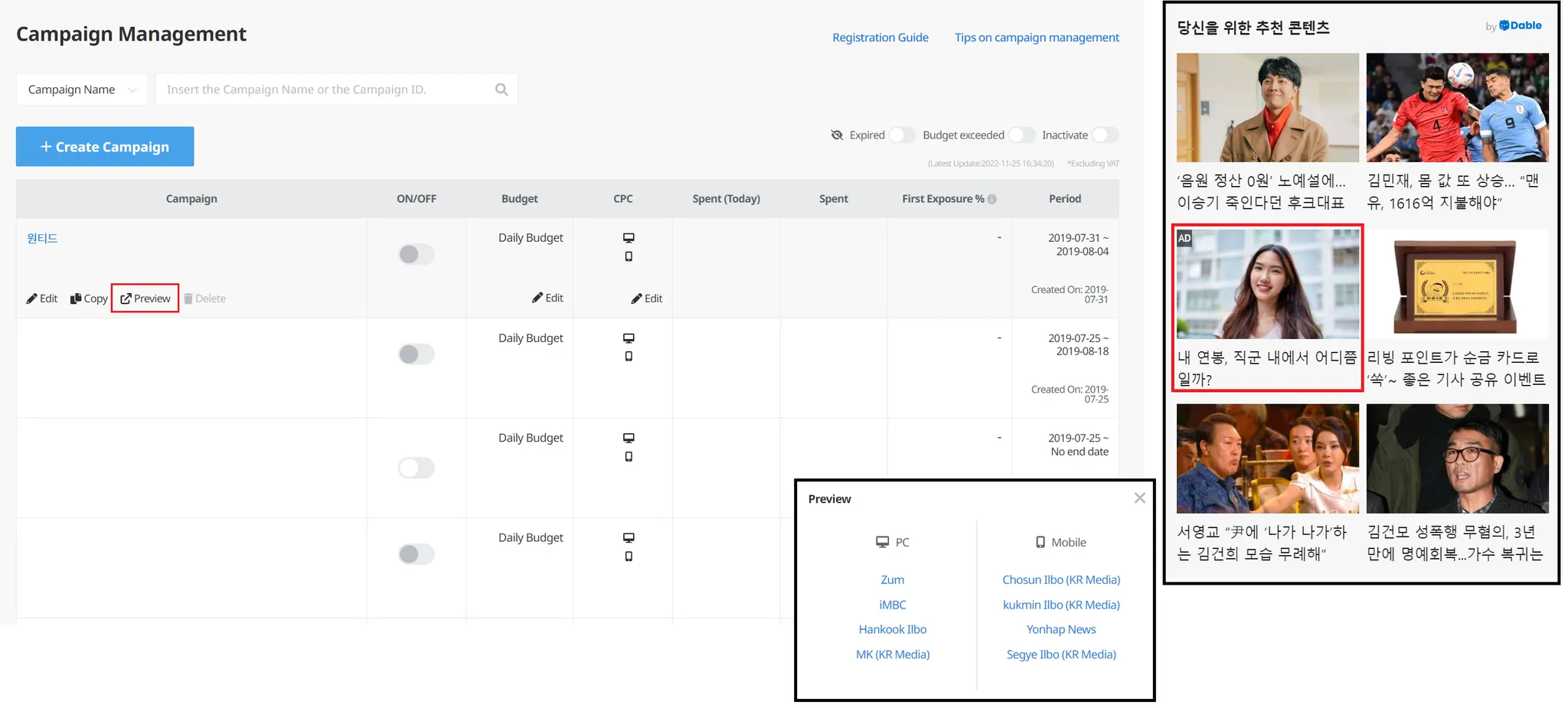 You can preview how your campaigns are shown in Dable’s partner sites. PC and mobile versions are provided. Hover the mouse cursor over the ‘Campaign’ column and click on the ‘Preview’ button that appears.