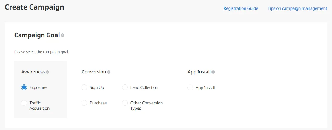 In the Create Campaign page, you can configure all settings related to campaign management including campaign goals, campaign type (single or multi contents), budget, exposure options, remarketing, region, etc.