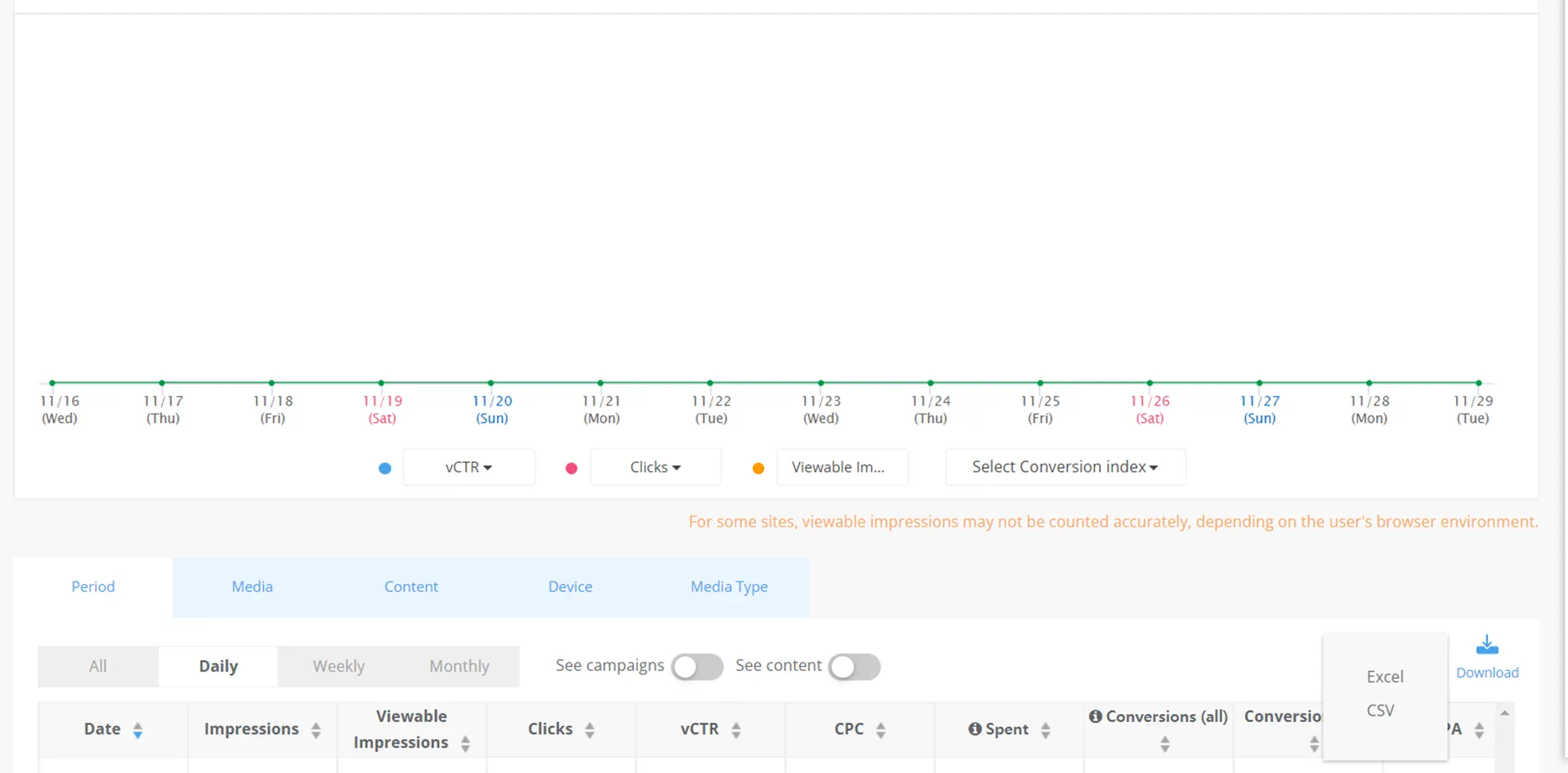 In the Performance page, you can see detailed data on ad performance based on time, media, site, campaign, device, contents, etc. You can optimize your content and campaigns and increase ad efficiency by using this data.