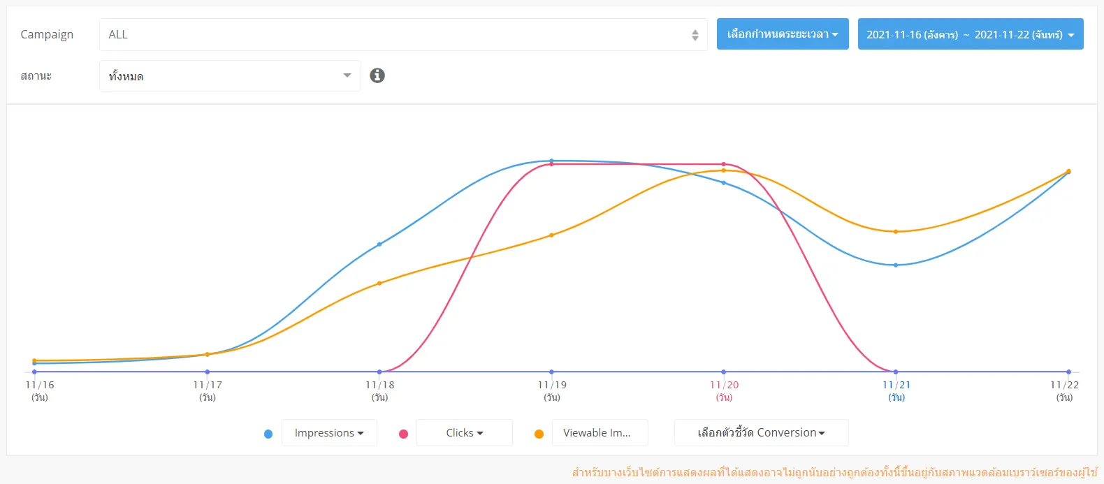 ในหน้าเมนูประสิทธิภาพ คุณสามารถดูรายละเอียดข้อมูลเกี่ยวกับประสิทธิภาพของโฆษณาได้ตามเวลา สื่อ เว็บไซต์ แคมเปญ อุปกรณ์ คอนเทนต์โฆษณา ฯลฯ โดยคุณสามารถใช้ข้อมูลนี้ในการเพิ่มประสิทธิภาพของเนื้อหาและแคมเปญ ตลอดจนประสิทธิภาพของโฆษณาได้