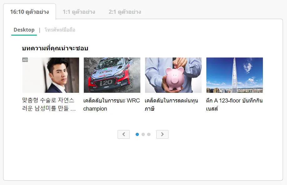 ตรวจสอบดูให้รูปภาพโฆษณาของคุณพอดีกับหน้าที่โฆษณาแสดงอยู่ คลิกที่นี่เพื่อดูการตรวจสอบเนื้อหาของ Dable – รูปภาพโฆษณา (รูปขนาดย่อ): 640*400 px, ไฟล์ควรมีขนาดไม่เกิน 2 MB และอยู่ในรูปแบบ .jpg, .jpeg หรือ .png – ชื่อโฆษณา: ควรมีความยาวไม่เกิน 56 อักขระ รวมการเว้นวรรคและไม่อนุญาตให้ใช้ข้อความที่มีการกล่าวเกินจริง