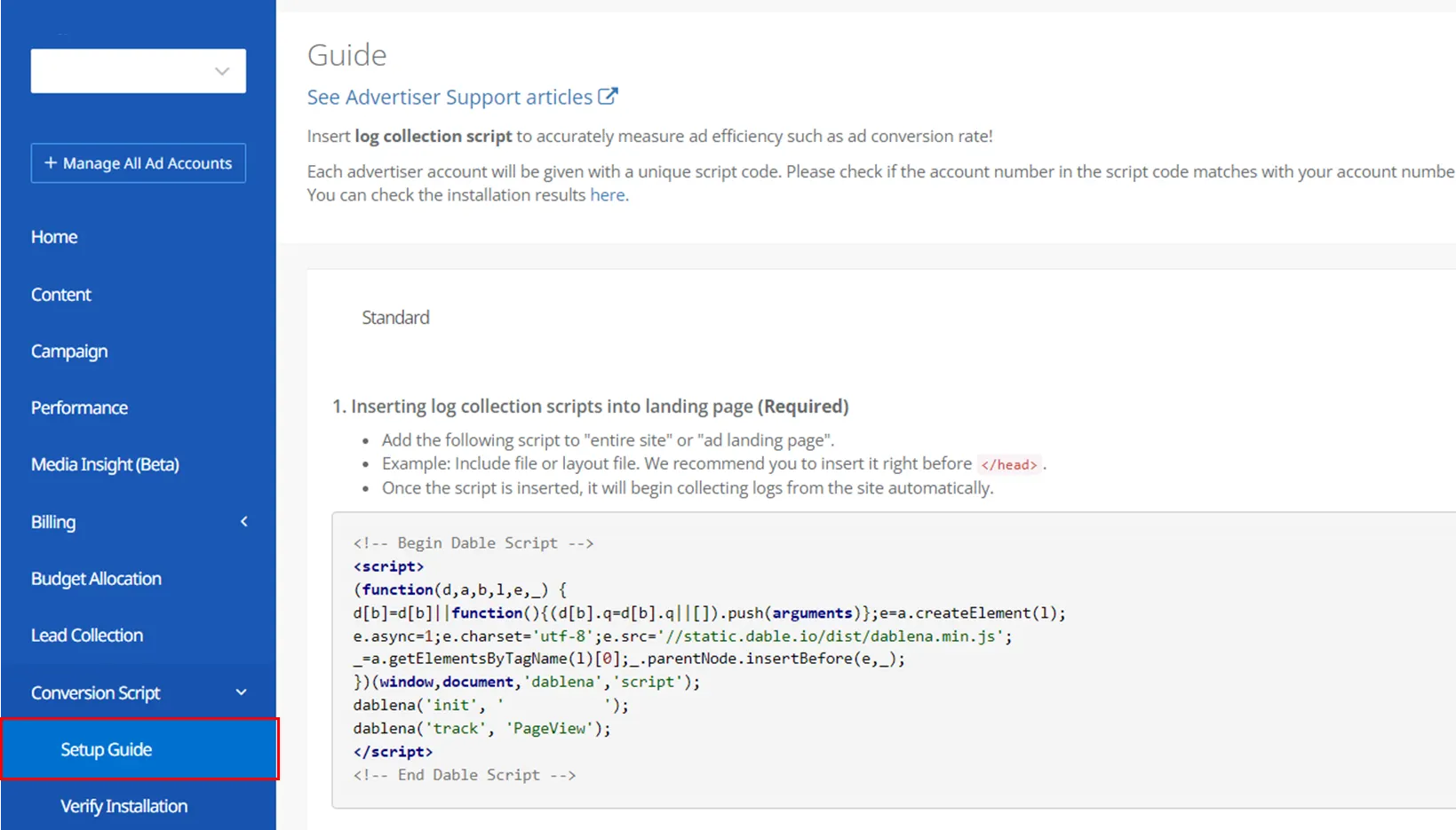 To see the conversion script for your ad account, click on the ‘Conversion Script’ menu on the left side of the dashboard.