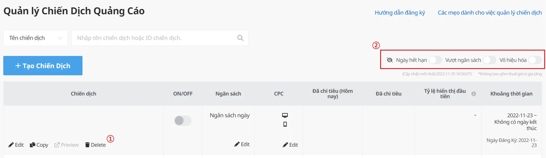 Quản lý Chiến dịch - Di chuột vào chiến dịch - Nhấp vào nút ‘Xóa’ được hiển thị