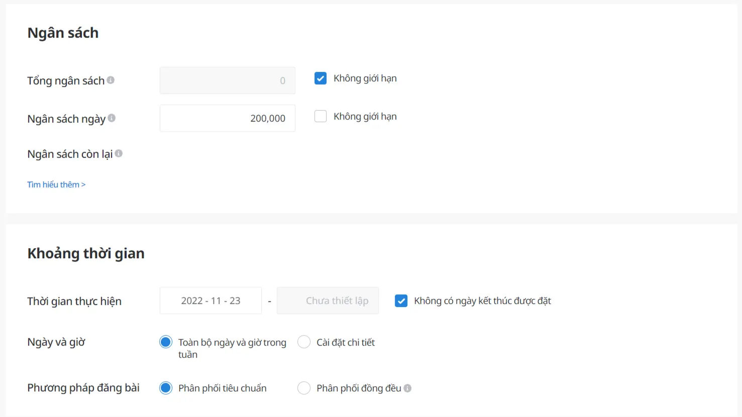 Bạn có thể thay đổi tùy chọn chi tiêu ngân sách mà bạn đã chọn trong quá trình tạo chiến dịch. Nếu chiến dịch đang hoạt động, bạn có thể thay đổi tùy chọn sau khi hủy kích hoạt nó 6 giờ.