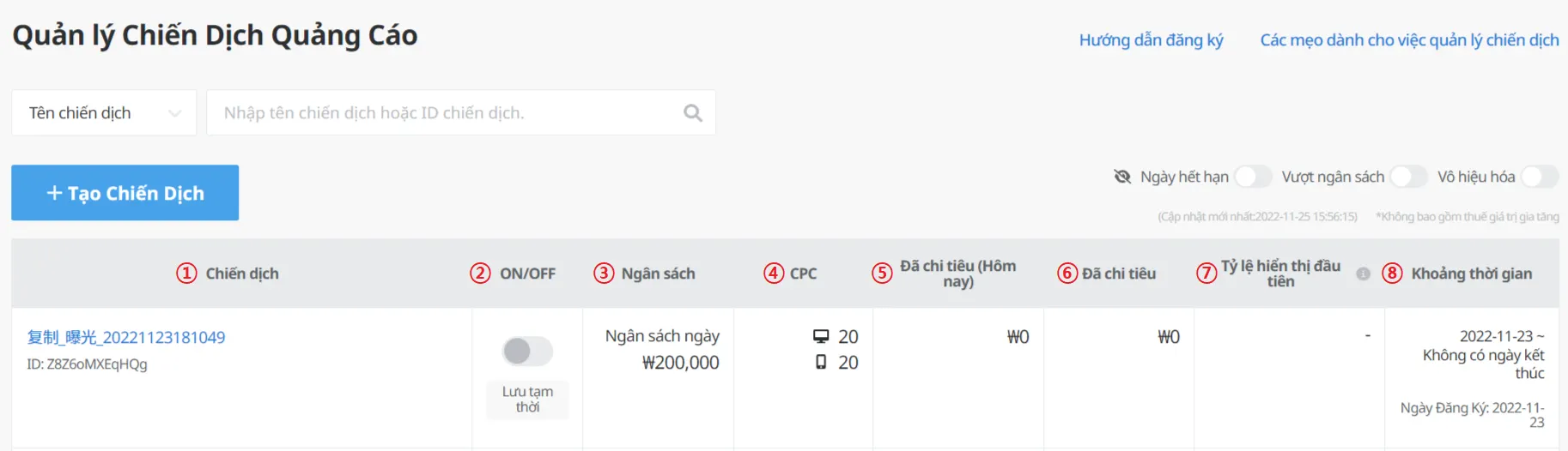 ① Tiêu đề của chiến dịch ② Chuyển đổi nút gạt để kích hoạt/hủy kích hoạt chiến dịch. Chiến dịch của bạn cần được kích hoạt để phân bổ quảng cáo. ③ Tùy chọn ngân sách của chiến dịch và số tiền. ④ CPC tối đa của chiến dịch. Số tiền này có thể khác nhau tùy thuộc vào mỗi ngành. ⑤ Số tiền chi tiêu cho ngày hôm nay. ⑥ Tổng số tiền đã chi tiêu trong suốt thời gian của chiến dịch. ⑦ Tỷ lệ hiển thị đầu tiên của chiến dịch. ⑧ % hiển thị đầu tiên bị chặn bởi IAS ⑨ Ngày tạo chiến dịch.