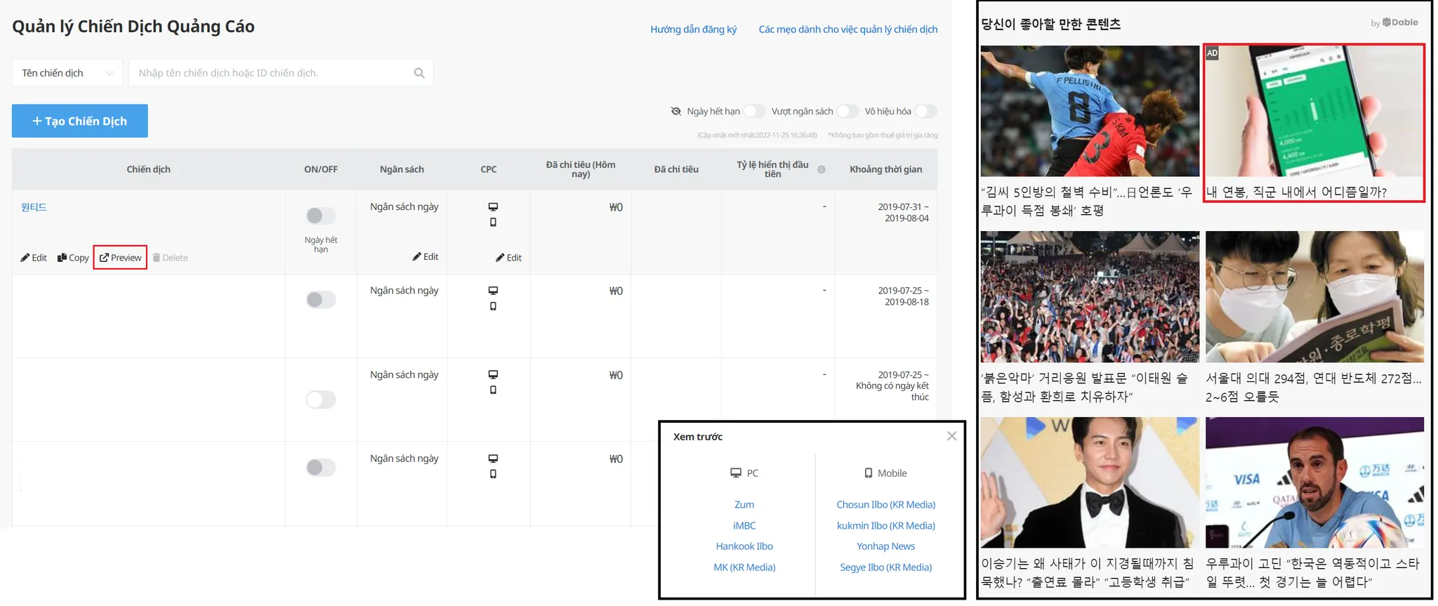 Bạn có thể xem trước cách các chiến dịch của mình được hiển thị trên các trang web đối tác của Dable. Phiên bản máy tính và điện thoại di động sẽ được cung cấp. Di con trỏ chuột tới cột ‘Chiến dịch’ và nhấp vào nút ‘Xem trước’.