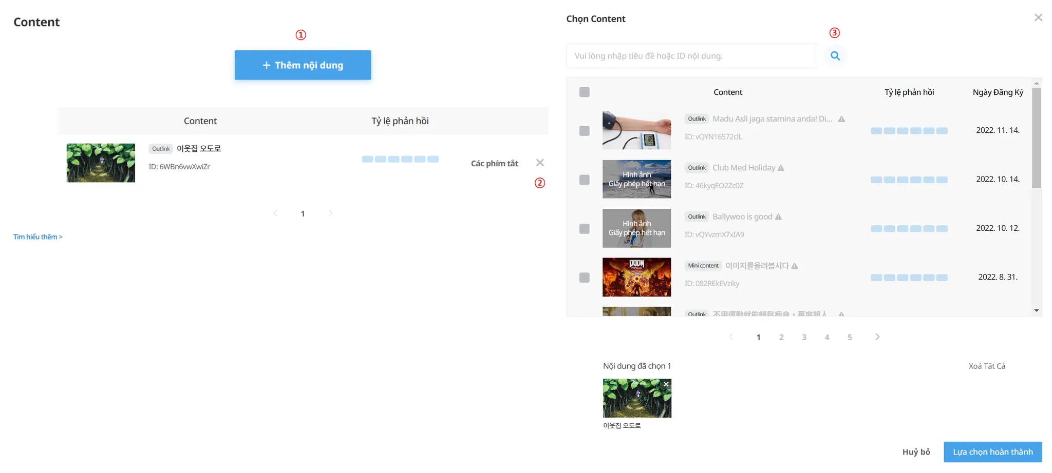Quản lý Chiến dịc - Chọn chiến dịch – truy cập ‘Nội dung’ – nhấp vào nút ‘+ Thêm nội dung’ button – Nhấp chọn tất cả các nội dung cần thêm – ‘Chọn’ – ‘Lưu’