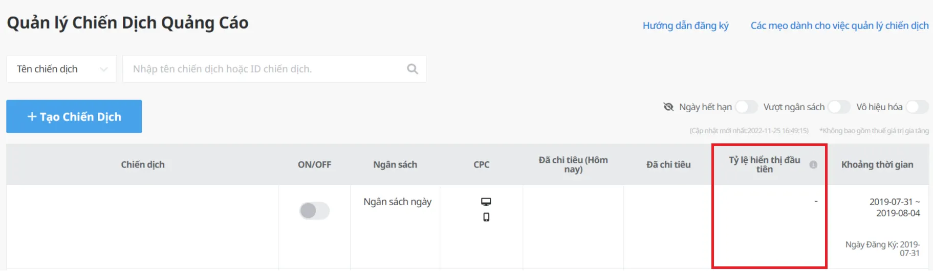 Tỷ lệ hiển thị đầu tiên: Tỷ lệ người dùng đã xem chiến dịch của bạn lần đầu tiên. Được tính bằng cách chia số người xem đầu tiên cho tổng số lần hiển thị vào một ngày nhất định.
