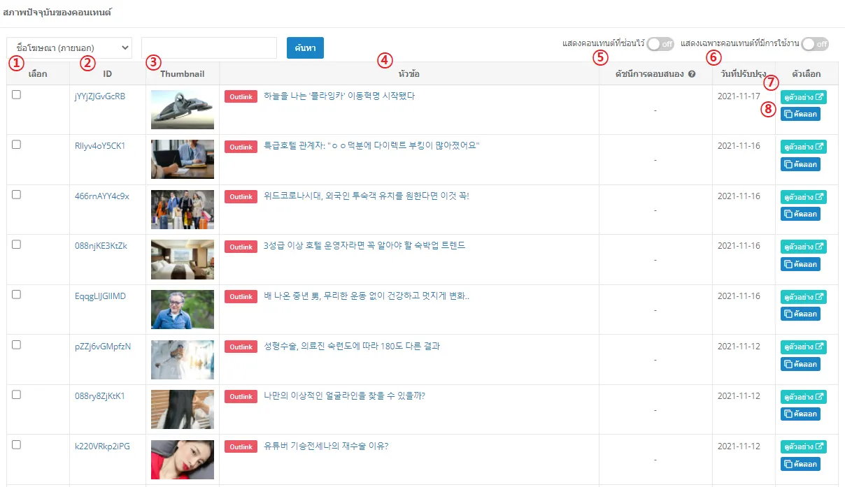 คุณสามารถตรวจดูเนื้อหาที่สร้างเสร็จแล้วหรือกำลังสร้างอยู่ทั้งหมดได้จากสถานะของเนื้อหาในหน้าการจัดการเนื้อหา