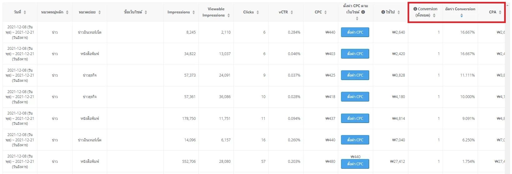 ในหน้ารายละเอียดของประสิทธิภาพ คุณสามารถปรับค่า CPC ของแต่ละเว็บไซต์ตามจำนวนคอนเวอร์ชันหรืออัตราคอนเวอร์ชันได้