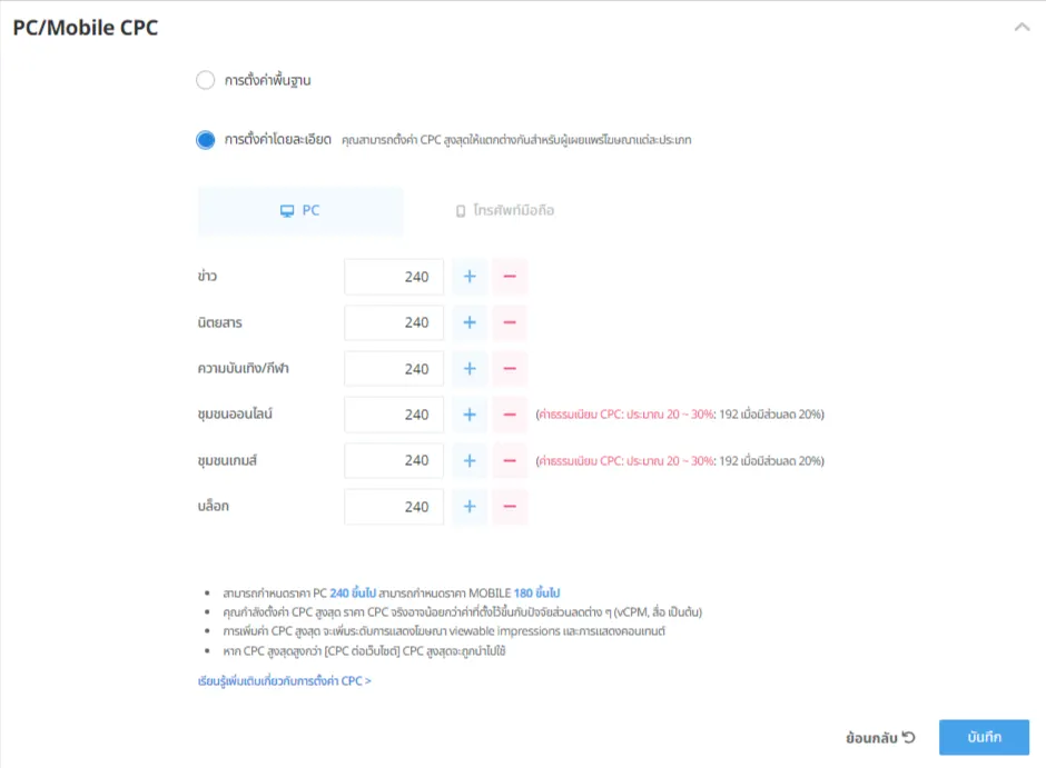 เปลี่ยนการตั้งค่า CPC สูงสุด > การตั้งค่าโดยละเอียด